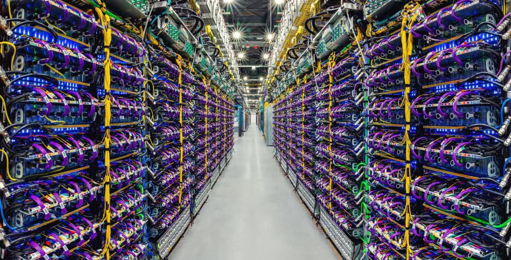 Google 数据中心内一排 Cloud TPU v5p AI 加速器超级计算机。
