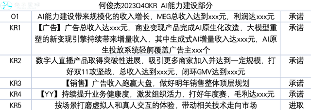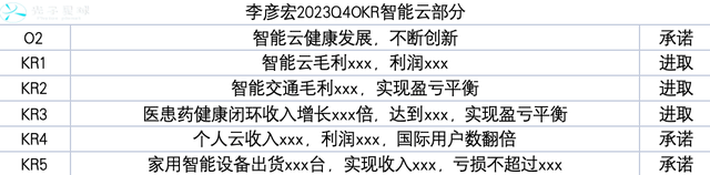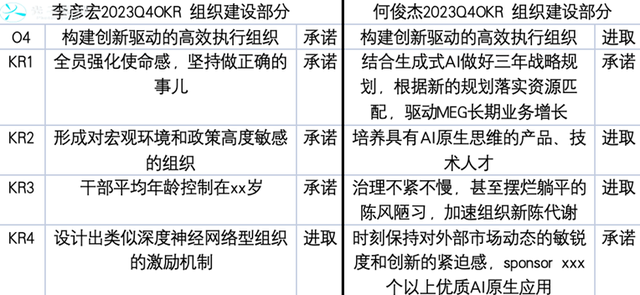 对比李彦宏与何俊杰OKR的对齐情况可以看到,在集团组织建设有更刚性的要求下,MEG反而动作相对较小,一个进取型的O与两个进取型的KR。