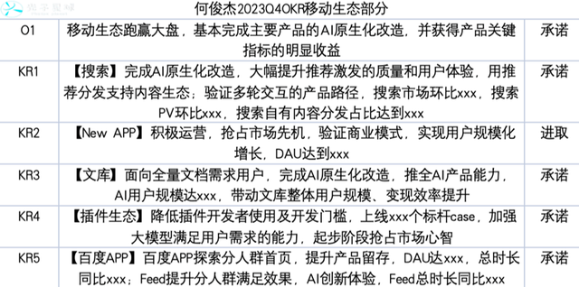 结合百度集团资深副总裁,百度MEG总经理何俊杰的OKR可以看到,其4个O中,除组织建设外,其余三个涉及到业务的目标全部为承诺型。这表明,当下移动生态的任务目标确定性强。
