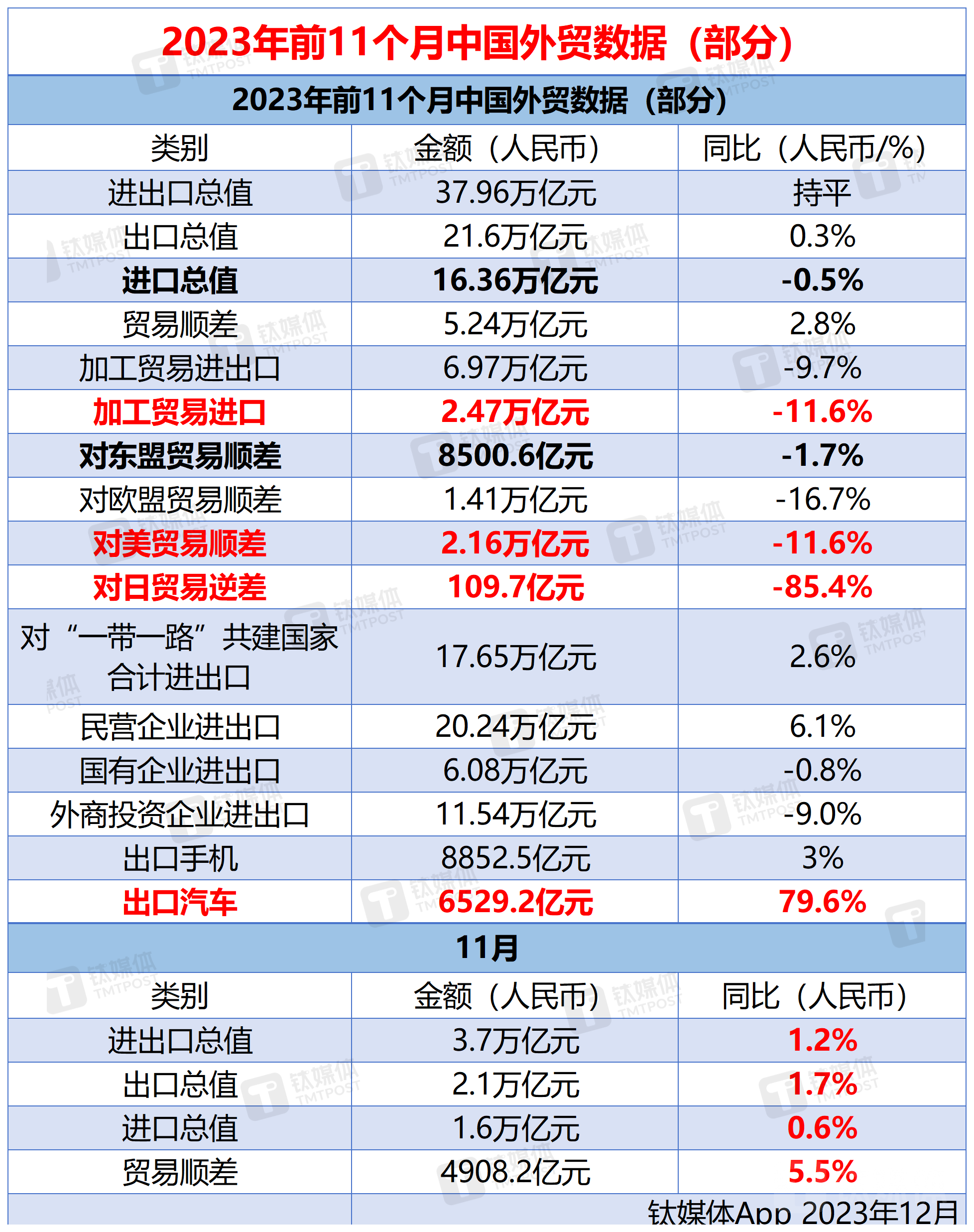 12月7日消息,海关总署发布今年前11个月外贸数据。据海关统计,前11个月进出口总值37.96万亿元人民币,同比持平;加工贸易进口2.47万亿元,同比下降11.6%。前11个月对东盟贸易顺差8500.6亿元,收窄1.7%;对欧盟贸易顺差1.41万亿元,收窄16.7%;对美贸易顺差2.16万亿元,收窄11.6%;对日贸易逆差109.7亿元,收窄85.4%;出口手机8852.5亿元,同比增长3.3%;出口汽车6529.2亿元,同比增长79.6%。