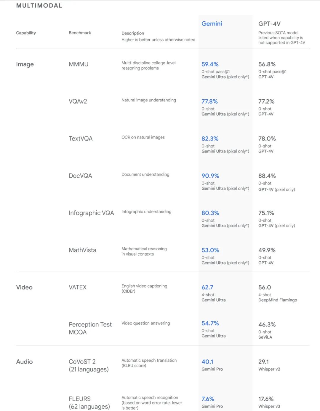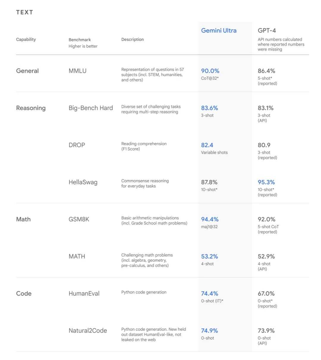 Gemini模型与GPT-4部分测试评分对比,图片来源:谷歌