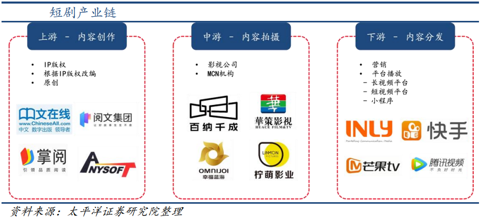 短剧的火热在海内外同步上演,剧本是类似的爽文套路,且二者产业链构成基本一致:上游内容创作,中游内容拍摄,下游内容分发。