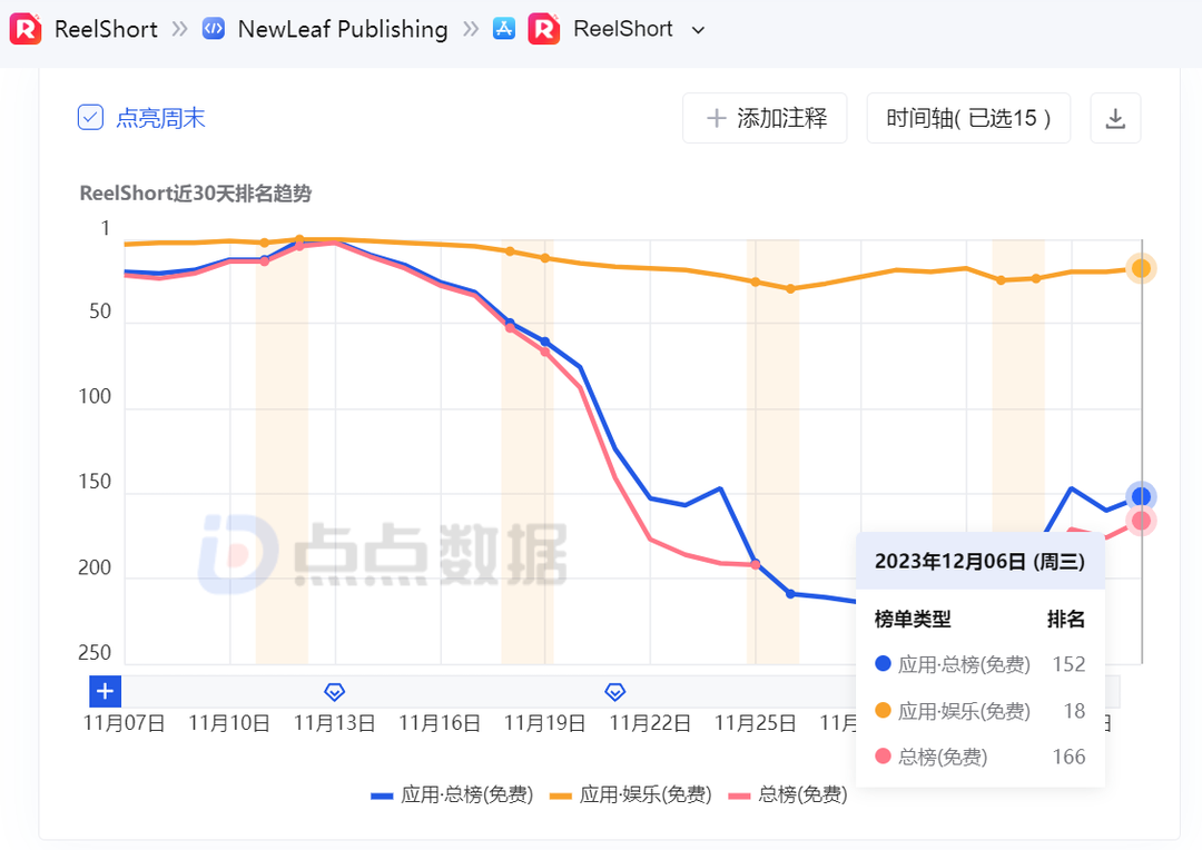 据移动数据分析平台“点点数据”统计,11 月 12 日,ReelShort 在美国 iOS 娱乐类免费应用中下载量一跃至榜首;截至 12 月 6 日,排名为第 18 位。