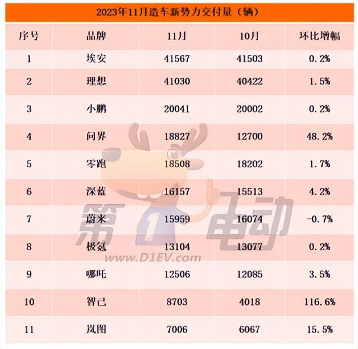 11月造车新势力销量排行榜中,问界跻身第四,仅次于理想、小鹏。数据显示,问界单月销量达到18827辆,环比增长48.2%,其中仅问界新M7一款车就交付了15242辆,占比超80%。同时,问界新M7上市两个半月累计大定已经突破10万辆。预计12月交付量将超过2.3万辆,2024年月交付能力超过3万辆。