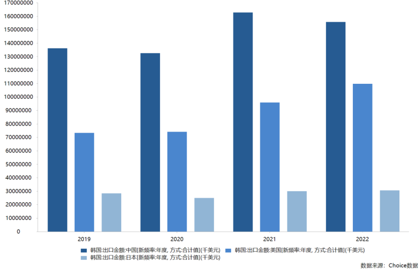 2019-2022年,韩国对中国出口金额分别为1362亿美元、1326亿美元、1629亿美元、1558亿美元,均超过美国和日本之和。