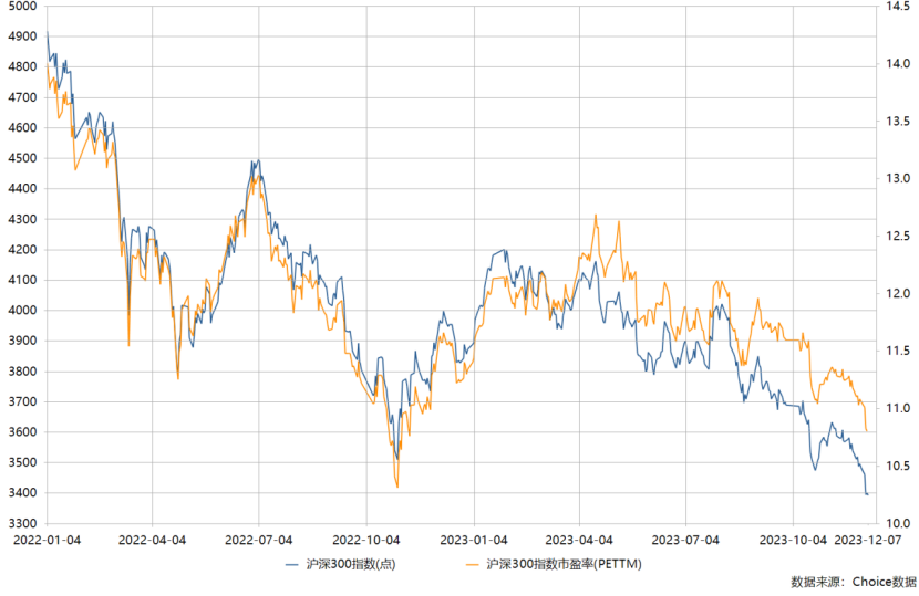 此外,最新沪深300指数也已经低过2022年10月份、“放开”前至暗时刻的水平;同时,从估值水平看,最新沪深300指数市盈率为10.8倍,也十分接近去年10月“放开”前的10.31倍数据。