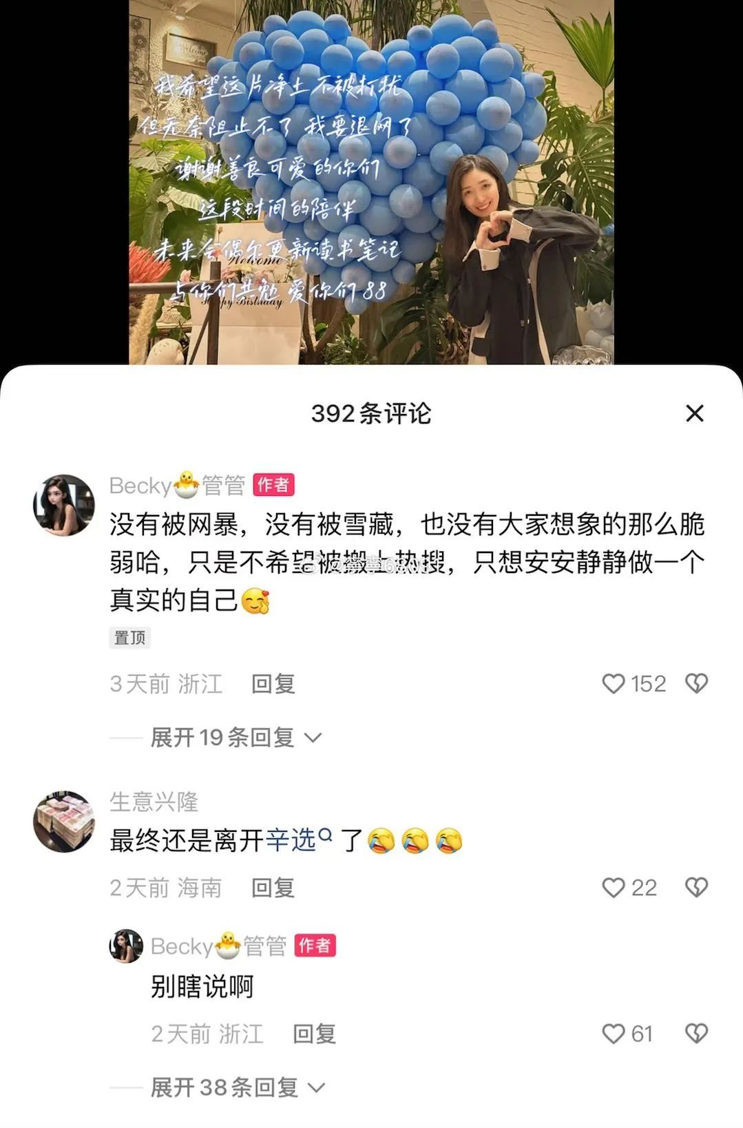 10月30日管倩曾发布视频宣布退网引发热议,随后在视频评论区曾否认离开辛选,但目前该视频已被删除。