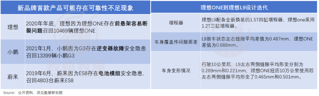 通常来说,新品牌首款车因为缺乏经验积累,往往会出现产品设计或质量控制的问题,以理想为例,理想ONE车主所吐槽的“增程器振动噪音大”的问题,到了L9车型就有所缓解。