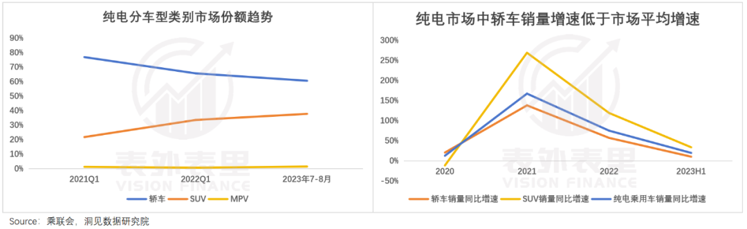 乘坐舒适度不高、性价比也滑落,新能源纯电轿车的市场份额从2021Q1的77%下滑至2023Q3的61%,且销量增速低于整体纯电销量增速。