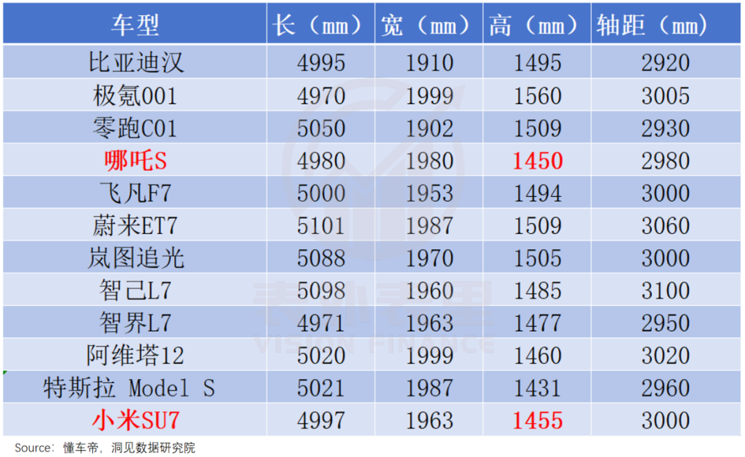 与小米SU7车身高度最接近的纯电轿车,是哪吒S——在试驾者的口中,其“第二排座椅靠背可以小幅调整,但1米8以上的大哥会顶头”。