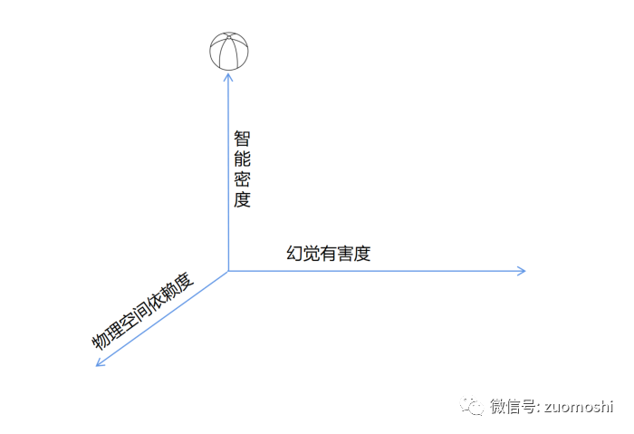 如果我们把智能的密度(原点是0),物理的程度(原点是0,代表纯粹数字应用),幻觉有害度(原点是0,代表幻觉无害)画一个坐标系,并把这个图放在正中心位置排列,那在下面这个示意图里面,最头部的是什么呢?
