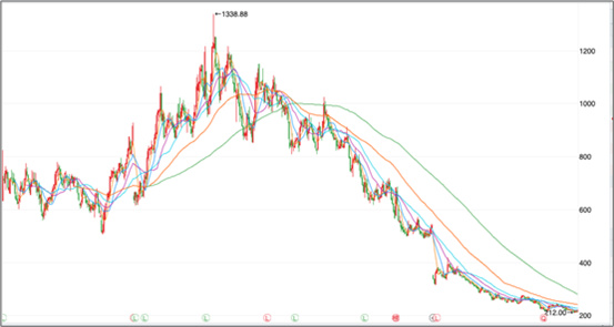 而投资者们也并没有继续“追捧”禾迈股份。经过了1338.68元/股的顶峰时刻后,禾迈股份股价便一路坐滑梯,目前已跌至200元一线附近。