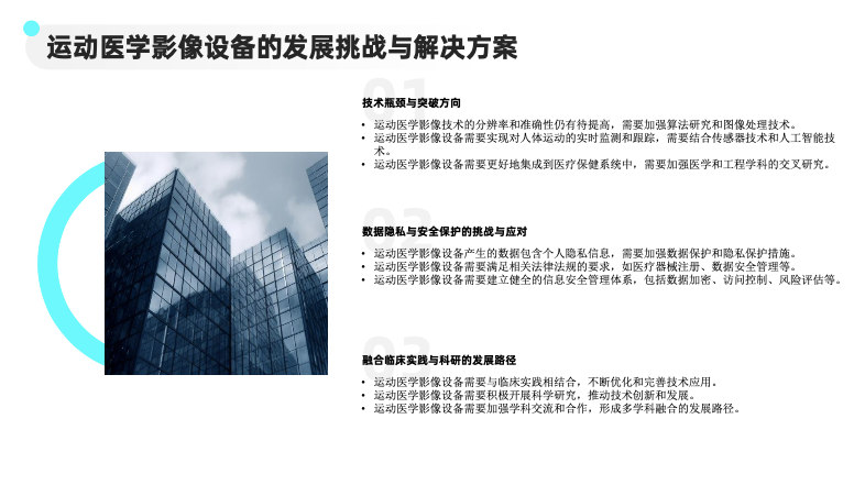 医学影像设备的发展挑战和突破的瓶颈在哪里呢?首先,在老一代的影像设备上,它们的分辨率和准确性仍有待提高,需要强化算法。其次,运动医学影像设备需要实现对人体运动的实时监测和跟踪,可以通过更多的传感器技术和人工智能的方法来实现。最后,运动医学影像设备需要更好地集成到医疗保健系统中,还需要加强医工的融合和交叉。在数据隐私方面,也对运动医学影像设备带来了一些安全性的挑战,包括如何满足法规的要求以及信息安全的管理体系等。因此,融合临床实践、运动医学影像技术的科研发展,需要不断优化推动技术的创新和发展,通过学科交叉,才有可能在临床上更好地进行实践。