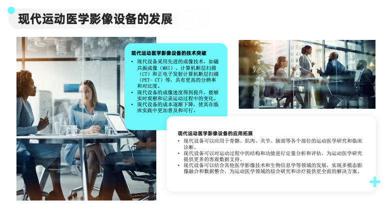 随着现代设备的巨大突破,可以记录运动过程中微小结构和细节变化,而成本的下降将促使医学影像设备在临床实践中的普及增加。我们可以用现代设备对骨骼、肌肉、关节等各个部位进行运动医学研究和诊断,甚至包括脑部,了解脑部的信号传递与骨关节的运动之间的关联。现代设备使结构和功能能够进行客观的定量分析和评估。此外,现代影像设备还能够与其他生物信息学领域进行融合,形成数据的融合,为运动医学提供更全面的解决方案。