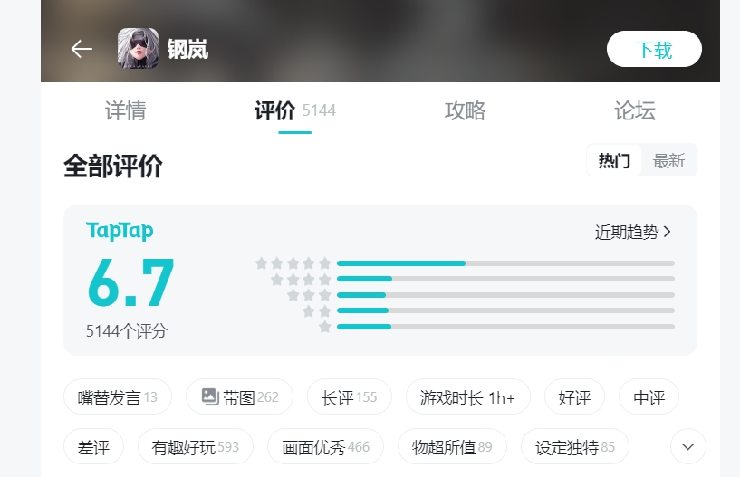 换言之,《钢岚》在吸引用户层面上,项目组会通过硬核细节要素服务核心玩家,但游戏玩法的乐趣度就是扩大用户圈层的关键。从上线以来的数据表现来看,《钢岚》市场表现不俗,目前仍在iOS畅销榜前列,说明了用户对“机甲”产品的接受程度尚可,并没有开服即弃坑,还愿意持续玩下去。可是TapTap评分不足7分,也说明了用户之间出现了分化。