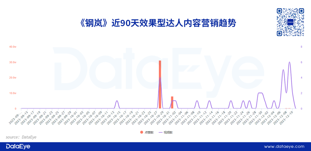 DataEye-ADX达人营销数据显示,《钢岚》项目组从10月份开始进行了达人内容采买,在上线爆发阶段相关达人视频营销内容有所增加。
