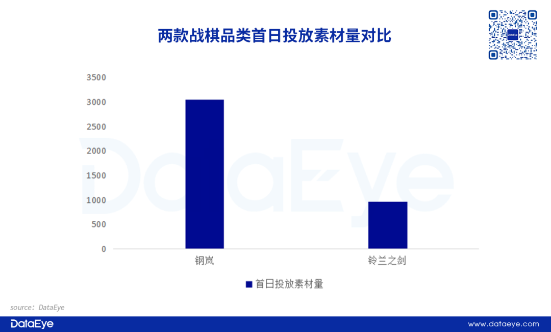 具体到投放量,近期上线的战棋类产品《铃兰之剑》首日投放仅为《钢岚》1/3。只是《铃兰之剑》后续投放素材量力度稳定、维持,而《钢岚》在首日投放爆发后,素材投放量有明显下滑趋势,是常见的一波流投放趋势。