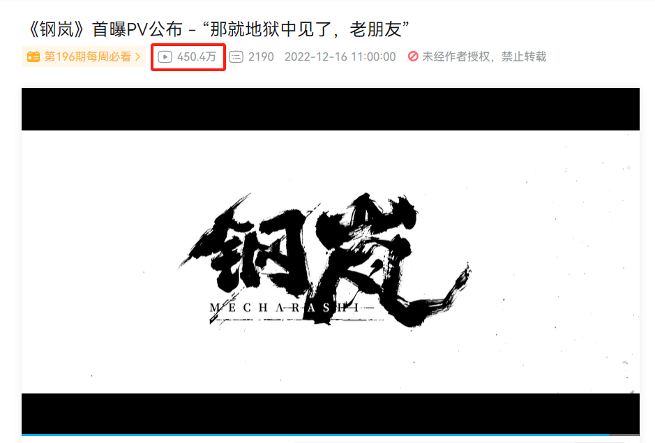 《钢岚》在去年12月16日发布了首曝PV,截至今年12月11日,该PV在B站已有超450万的播放量。随后项目组针对背景世界观、游戏实录制作3条内容,但播放量不算太突出。今年7月,《钢岚》获得版号,官方频道也有视频内容更新。