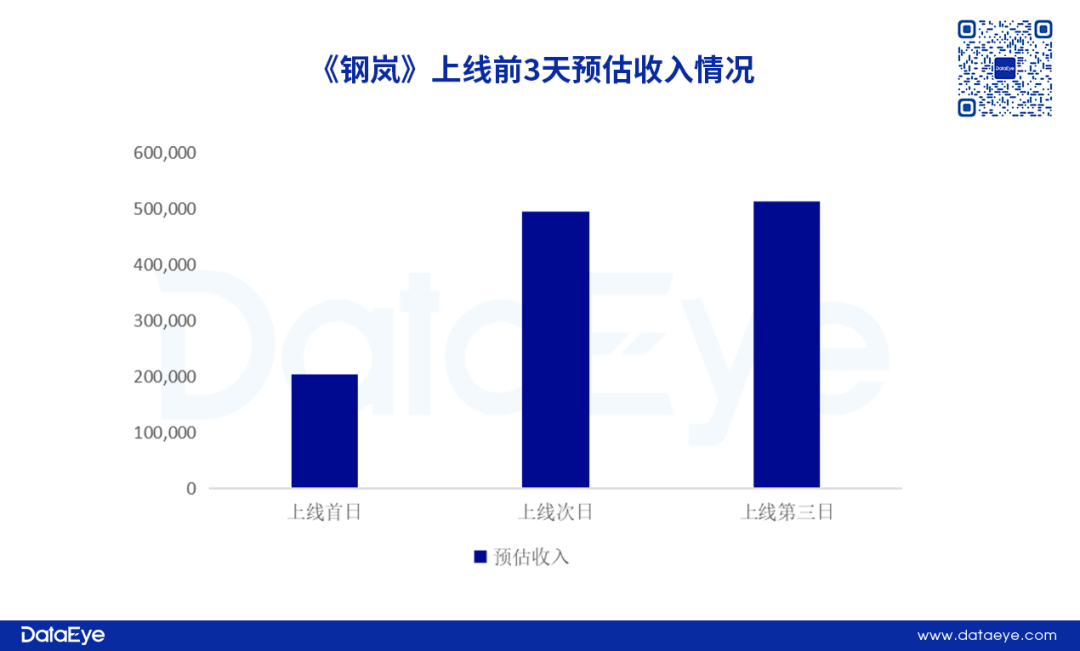 从预估下载表现(扣除了平台分成)来看,点点数据显示,《钢岚》上线三天预估累计收入超过1200万,上线次日有明显增长。