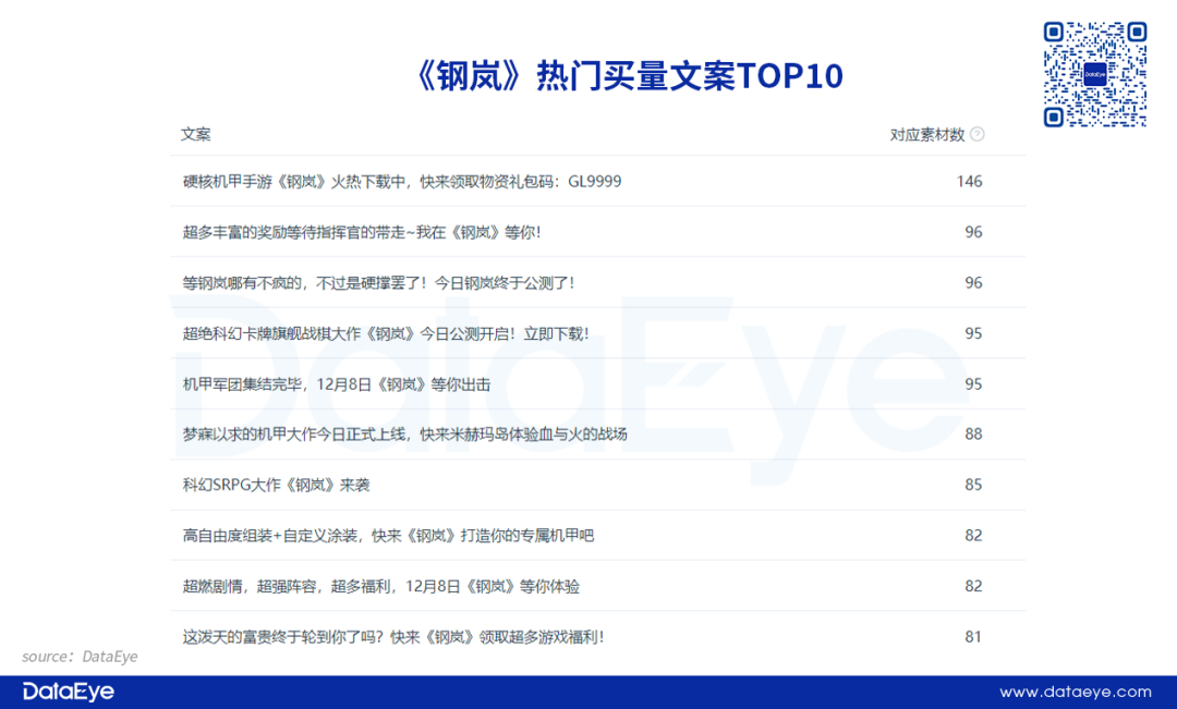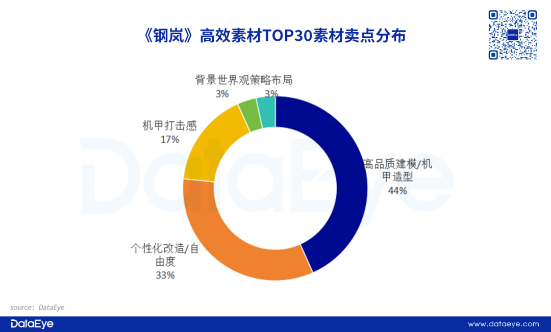 DataEye研究院认为,《钢岚》不依赖效果广告投放获客的情况下,创意素材就主推产品核心卖点,以核心受众群体为主。