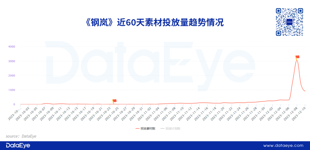 DataEye-ADX投放数据显示,《钢岚》在今年10月份开始进行测试素材投放。而在11月下旬开始进行产品预热准备,但日均投放素材并不突出,维持在100组左右。直到游戏上线爆发阶段,《钢岚》素材投放量大幅度飙升,其中上线首日突破3000组素材投放。