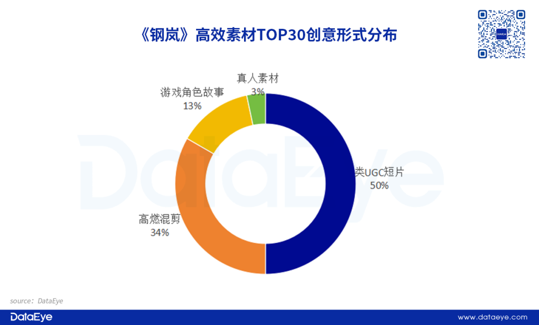 DataEye研究院整理了《钢岚》投放计划数TOP30的高效素材,其投放素材创意形式中,类UGC短片和高燃混剪占比较高,二者合计占比超过80%。游戏角色故事占比13%,真人剧情素材占比最少,只有3%。