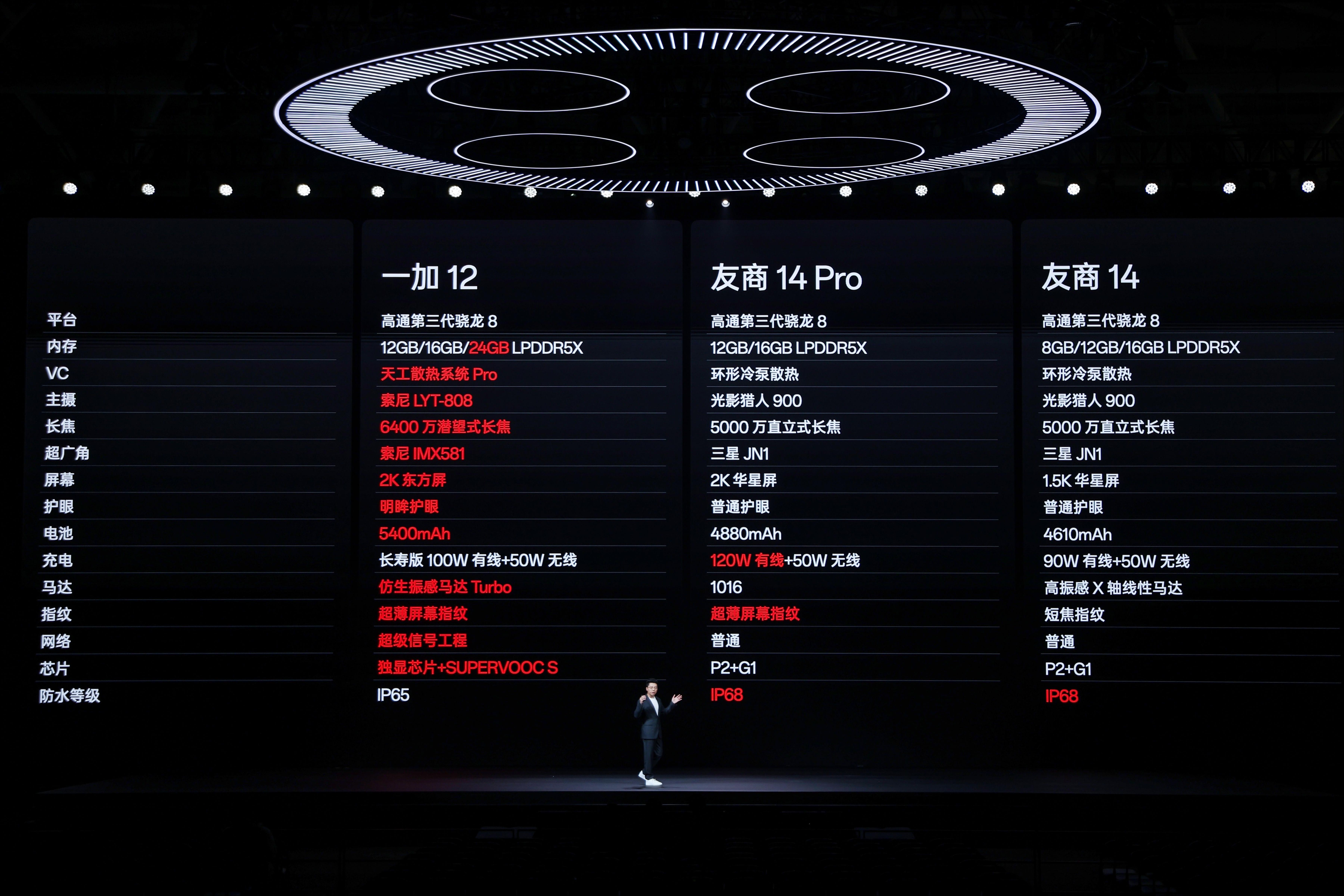 一加在战报中指出:一加12首销5分钟是友商14 Pro全天销量的61%。从发布会上各种PPT中围绕参数的横向比较,到开售后的持续喊话,一加和小米竞争的火药味正变得越来越浓。