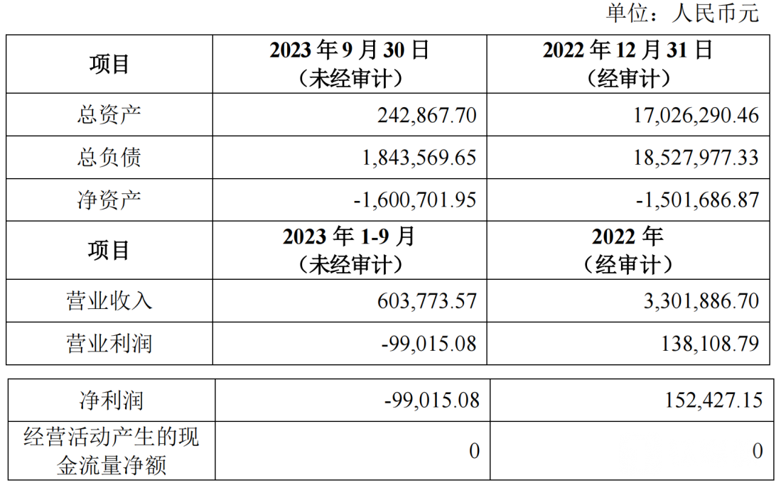 之文科技目前财务状况不容乐观,目前已经资不抵债。财务数据显示,2022年12月31日和9月30日,净资产分别为-150万元和-160万元;2022年与2023年1-9月,营业收入分别为330万元、60.3万元,净利润分别为15万元、-9.9万元;近年来经营活动产生的现金流净额为0元。如此财务背景之下,之文科技数亿元的支付费用将从何而来值得继续关注。