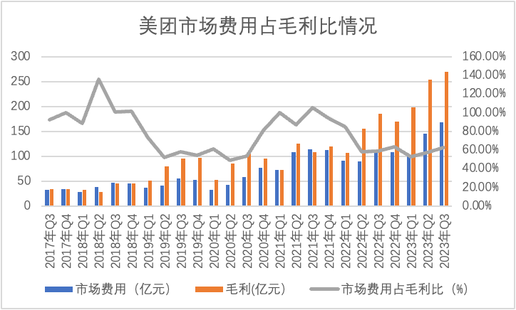 3)在用户培养期内,企业就要通过补贴等形式以提高获客效率,2023年Q3美团市场费用占毛利比较之此前有所抬头。