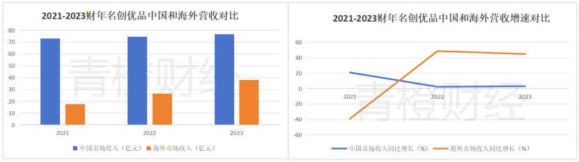 实际上,名创优品中国市场的收入增速已经连续两年低于海外市场的收入增速。2022财年和2023财年,名创优品中国市场收入分别为74.42亿元、76.51亿元,分别同比增长2.1%、2.8%;其海外市场收入分别为26.44亿元、38.22亿元,分别同比增长48.5%、44.6%。