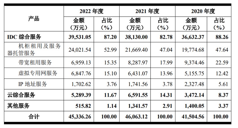 其中,包括机柜租用及服务器托管服务、带宽租用服务、IP 地址服务、虚拟专用网服务等IDC综合服务是发行人主营业务收入的主要构成部分。招股书显示,2020年、2021年、2022年,尚航科技IDC综合服务实现的收入为3.66亿元、3.81亿元及 3.95亿元,占公司主营业务收入的比重分别为 88.26%、82.78%及 87.20%,是公司的主要收入来源。