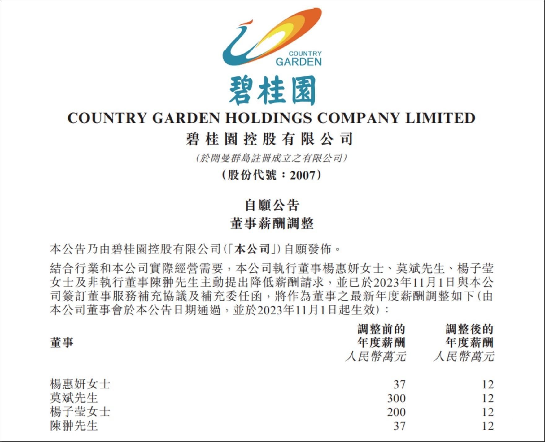 公告称,结合行业和公司实际经营需要,碧桂园执行董事杨惠妍女士、莫斌先生、杨子莹女士及非执行董事陈翀先生主动提出降低薪酬请求,并已于2023年11月1日与公司签订董事服务补充协议及补充委任函,将作为董事最新年度薪酬调整如下(由公司董事会于本公告日期通过,并于2023年11月1日起生效):杨惠妍由37万元调整至12万元;莫斌由300万元调整至12万元;杨子莹由200万元调整至12万元;陈翀由37万元调整至12万元。