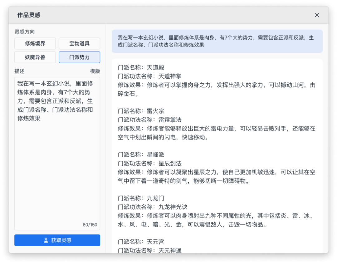 从阅文官方的介绍来看,作家助手妙笔版分别可以为作者提供设定灵感、角色灵感、卡文灵感、描写灵感和取名灵感等。具体来看,以角色灵感为例,作者可以选择作品类型、角色性别、类型和标签以及相关描述,从而由AI声称具体的角色称号、称号来源、势力、外貌、性格、功法和轶事等内容;以作品灵感来看,以玄幻小说为例,AI可以按照作者的大概设想,生成修炼境界、宝物道具、妖魔异兽、门派势力等信息,也可根据作者的设定生成打斗场景等。