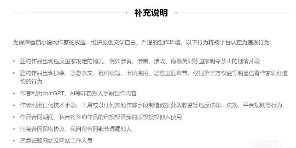 锌刻度留意到,在小红书上,有网文作者发布名为“用AI写作的可以省省了”的笔记,笔记提到,在网络文学交流互动平台“龙的天空”,有网友发布番茄小说的违规说明。该说明将“作者利用ChatGPT、AI等非自然人手段创作内容”列入了违规行为,而出现违规行为的作者将被酌情取消当月或全部稿酬及福利。