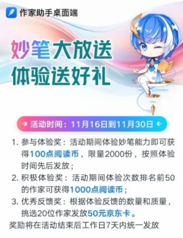 锌刻度留意到,在阅文作家助手桌面端的顶部banner处,有一则“妙笔体验送好礼”的通知,该通知显示,在11月16日到11月30日期间,体验妙笔能力即可获得100点阅读币;体验次数排名前50名的作家可获得1000点阅读币;根据体验反馈的数量和质量,挑选20位作家发放50元京东卡。而体验须知里强调,“本活动仅对已开通妙笔权限的作家生效”。