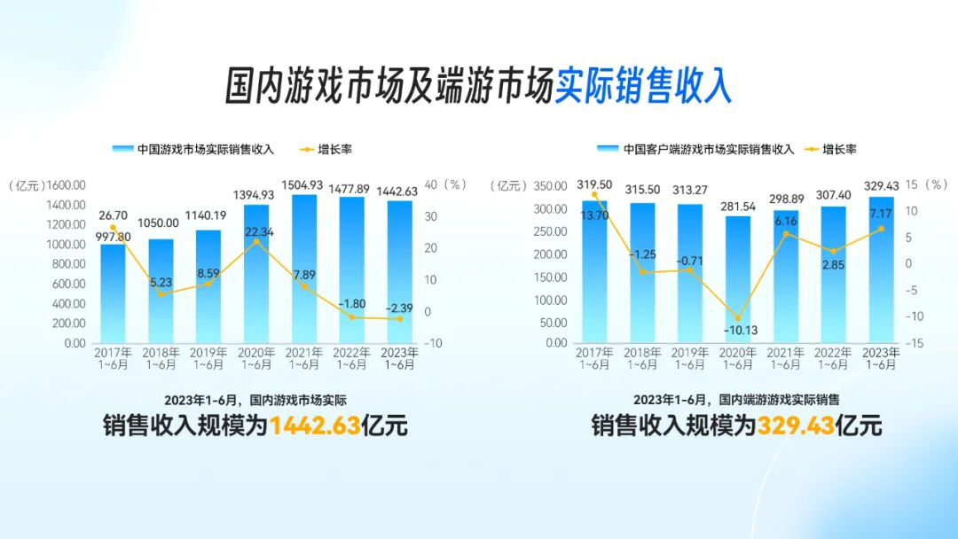 据中国音数协游戏工委 (GPC)与中国游戏产业研究院发布的《2023年1-6月中国游戏产业报告》显示,2023年1-6月国内游戏市场实际销售收入规模为1442.63亿元,其中端游游戏收入增长显著,实际销售收入达329.43亿元,同比增长7.17%。