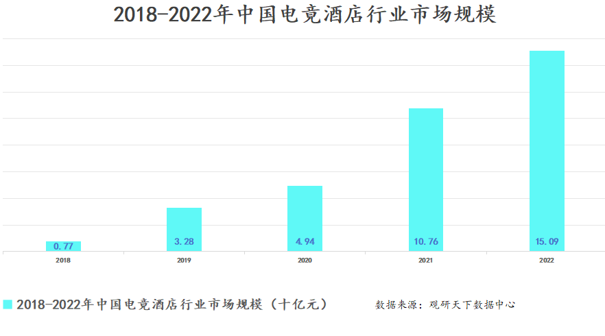 相对来说知名度与市场规模较大的,就是“电竞+酒旅”衍生出的电竞酒店行业。电竞酒店作为一种依托于电竞游戏的新型酒店,市场规模近些年随着电竞大热而水涨船高。根据携程发布的《电竞酒店分析报告》显示,这块蛋糕在2023年有望达到192亿市场规模。