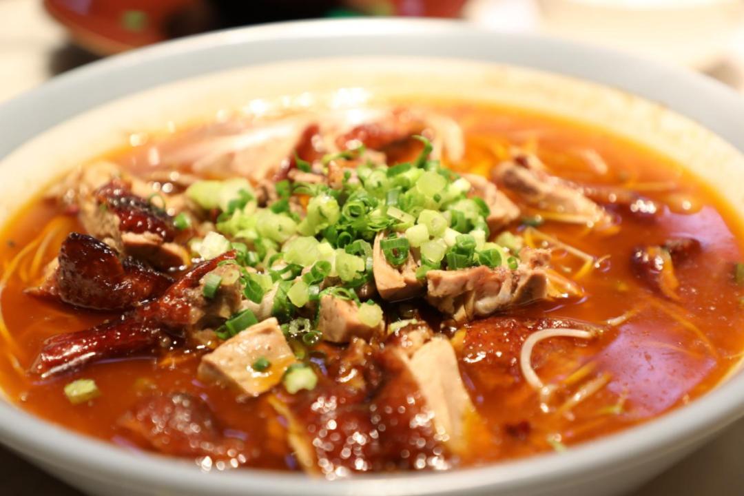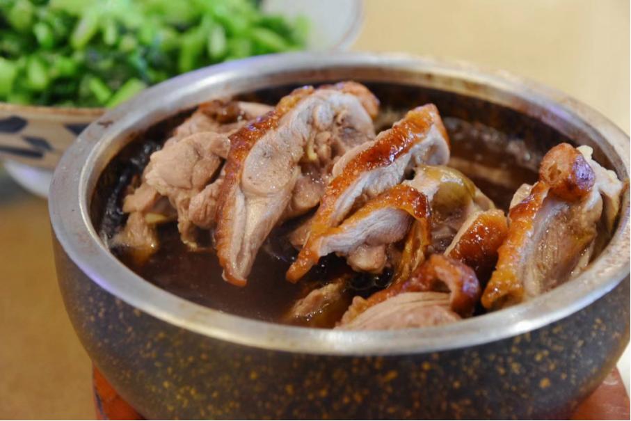 冒烤鸭起源于成都,指的是鸭子烤好后,以冒的烹饪方法对其进行烹制的一种做法,即用中药和各种调料配出的汤汁烫煮鸭子以及蔬菜、粉面等。