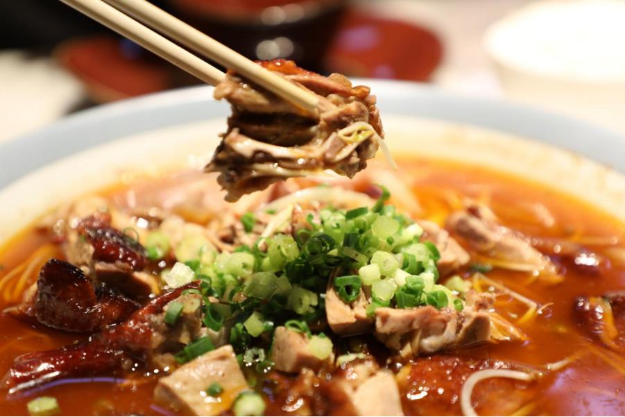 冒烤鸭的制作流程可主要分为烤鸭、特调汤底、烹制、调配碗料四大步骤,标准化程度高。