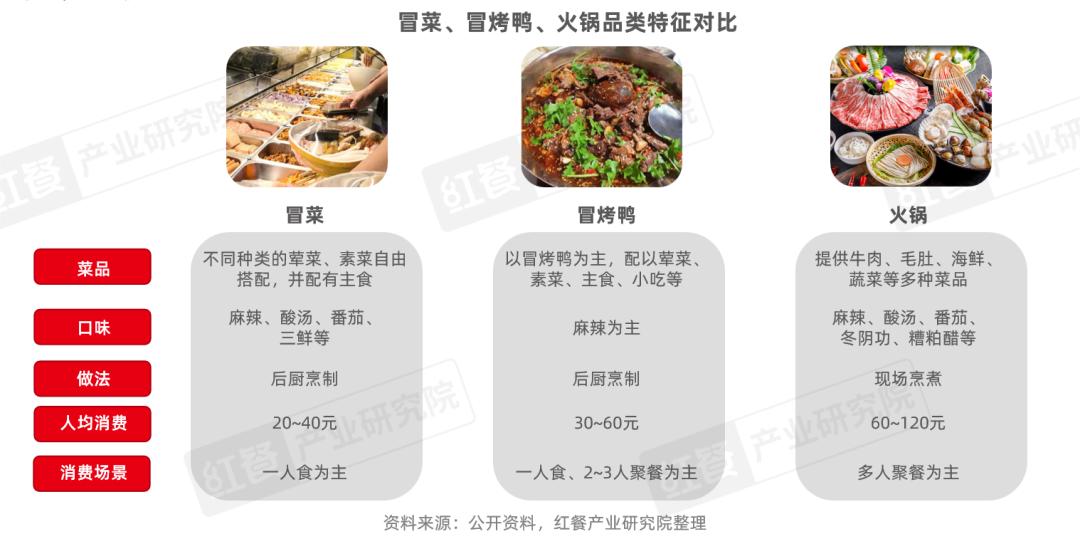 烤鸭的产品制作方式与火锅、冒菜有一定的相似度,均是把将食材放入热汤中烫熟。但实际上这三个品类在菜品、口味、做法、人均消费和消费场景上存在一些差异。