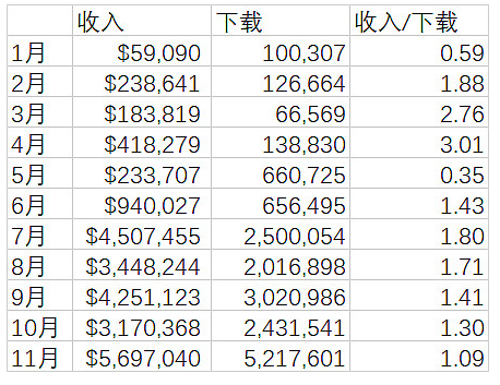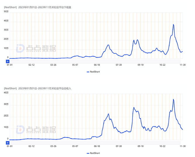 目前来看,随着越来越多的玩家涌入,已变成红海市场的短剧也出现了ROI降低的情况。以ReelShort为例,自7月份以来,ReelShort的收入下载比一直是持续下降的趋势,其收入下载比已从7月的1.8降低到11月的1.09。这意味着,同样的用户下载量,换取的用户收入越来越少。