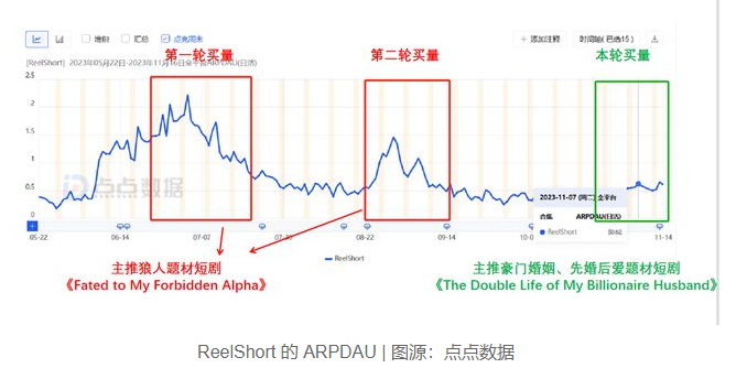 留存率的意义在于,对收入和回本周期有直接影响,低留存率使企业严重依赖下载量,需要企业持续花钱获客。而收入持续依赖新客,留存不了老客,也会使企业更容易遇到天花板。举个例子,由于用户留存率低,ReelShort的用户价值并没有像大多数平台一样会持续提升。如下图所示,ReelShort今年的ARPDAU在度过高点后,处于下降趋势。