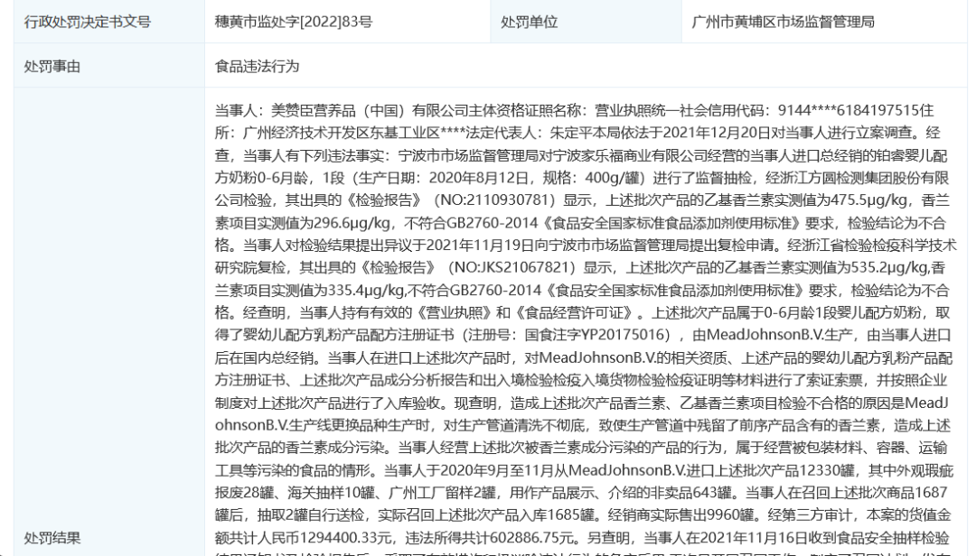 2022年4月2日,美赞臣营养品(中国)有限公司因食品违法行为被广州市黄埔区市场监督管理局罚款129.44万,没收金额约60.29万。处罚事由显示,美赞臣进口总经销的铂睿婴儿配方奶粉(0-6月龄,1段)抽检时乙基香兰素超标,复检依然不合格。