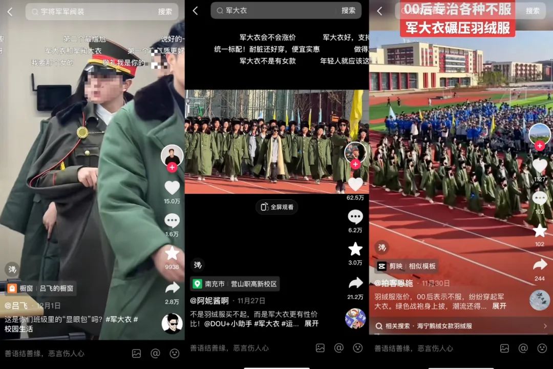 第二次是军大衣在大学校园流行,“军大衣统治班级”成为热梗;第三次则是央广网评军大衣销量大增。
