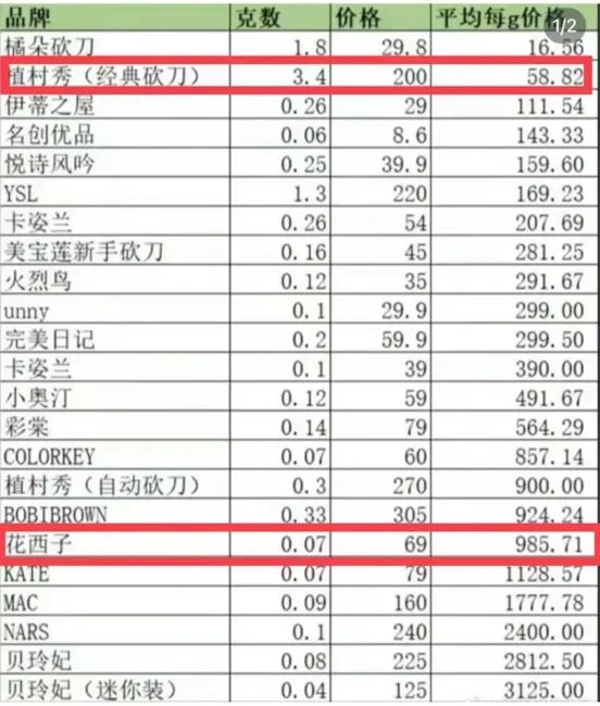 在花西子出于舆论漩涡中时,最流行的一个图是它与其他品牌眉笔单克重数价格的对比列表,得出的结论是,花西子单克价格超越植村秀、YSL等国际大牌,甚至比黄金还贵。