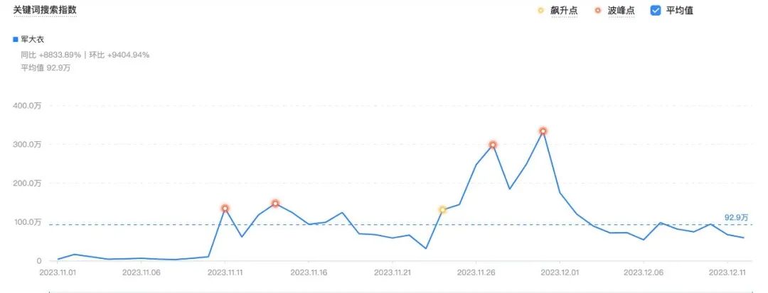 巨量算数显示,第一次是11月11日前后,“不是羽绒服买不起,而是军大衣更有性价比”这句流行爆梗在抖音登上热搜,军大衣搜索指数首次突破百万。