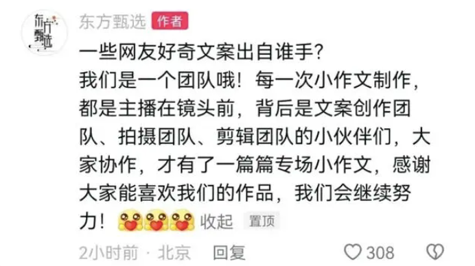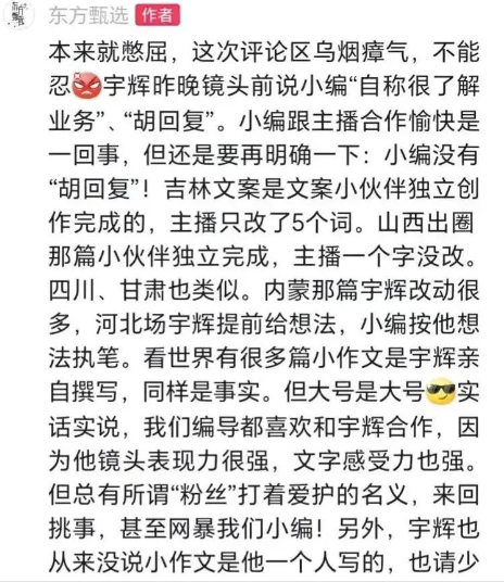 此次“后院起火”的起因在于“吉林之行”宣传文案到底出自谁之手。对于这一话题,东方甄选小编在“吉林之行”宣传视频下方声称,“每一次小作文制作都是主播在镜头前,背后是文案创作团队、拍摄团队、剪辑团队的小伙伴们,大家协作,才有了一篇篇专场小作文。”![]()