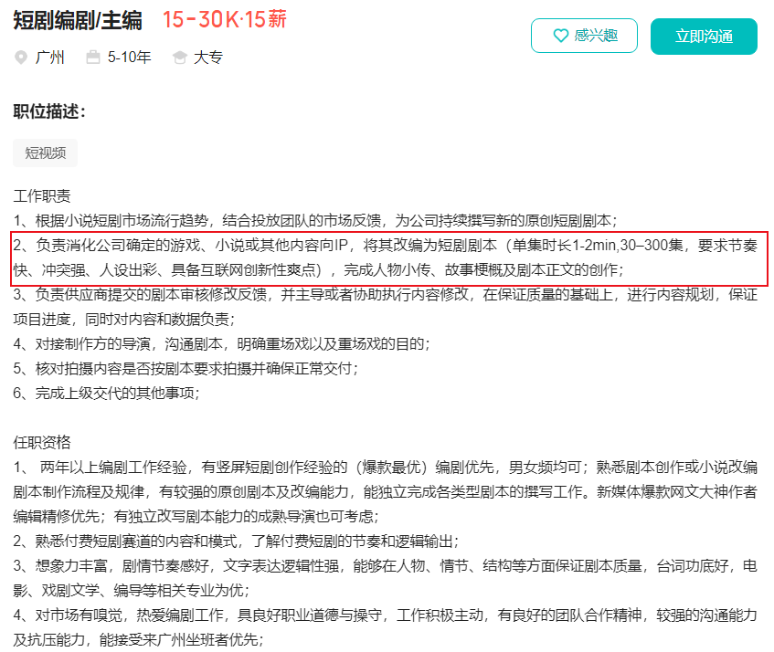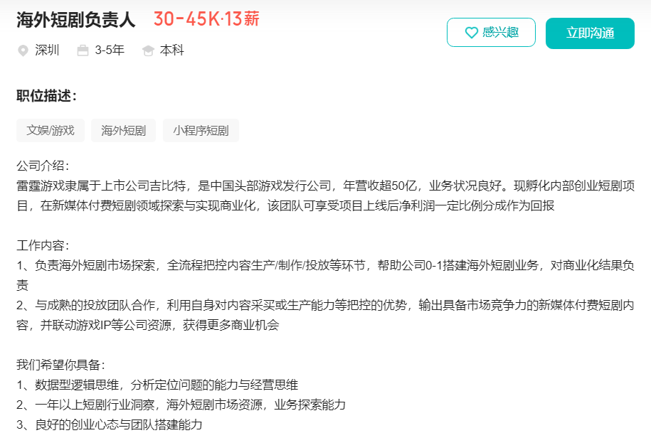Boss直聘招聘信息显示,近期三七、吉比特、冰川网络、中青宝、贪玩游戏、益世界、广州乐牛等游戏公司均在招聘短剧相关的岗位。