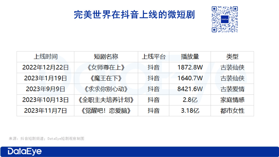 从2022年底,完美世界就开始在抖音平台试水微短剧,目前已推出五部微短剧,累计播放量超7亿。其中,近期上线的《觉醒吧!恋爱脑》、《全职主夫培养计划》分别位列抖音短剧最热榜榜首及第三名。