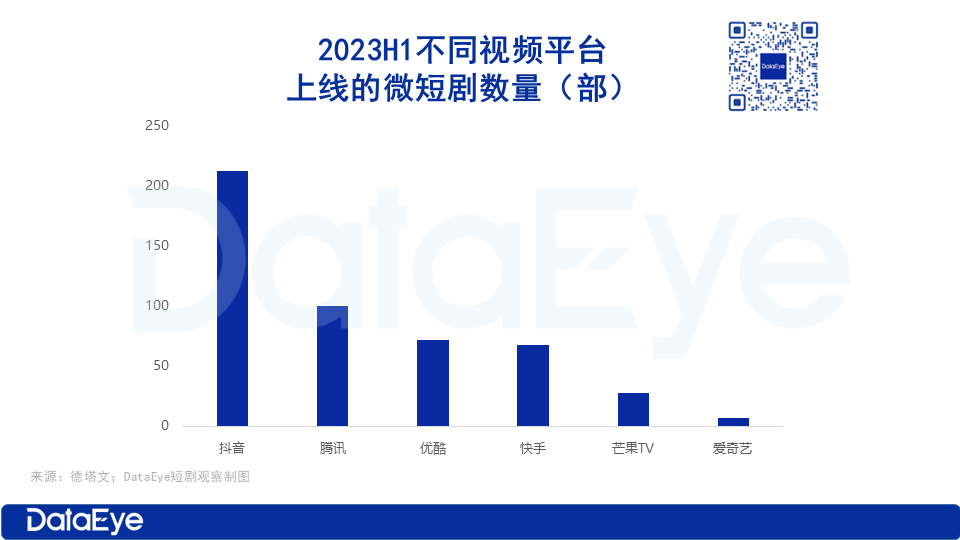 根据德塔文,2023年上半年国内长短视频平台共上线微短剧481部,其中抖音212部,腾讯和快手各上线100和68部,三大平台占据整个市场近8成份额。